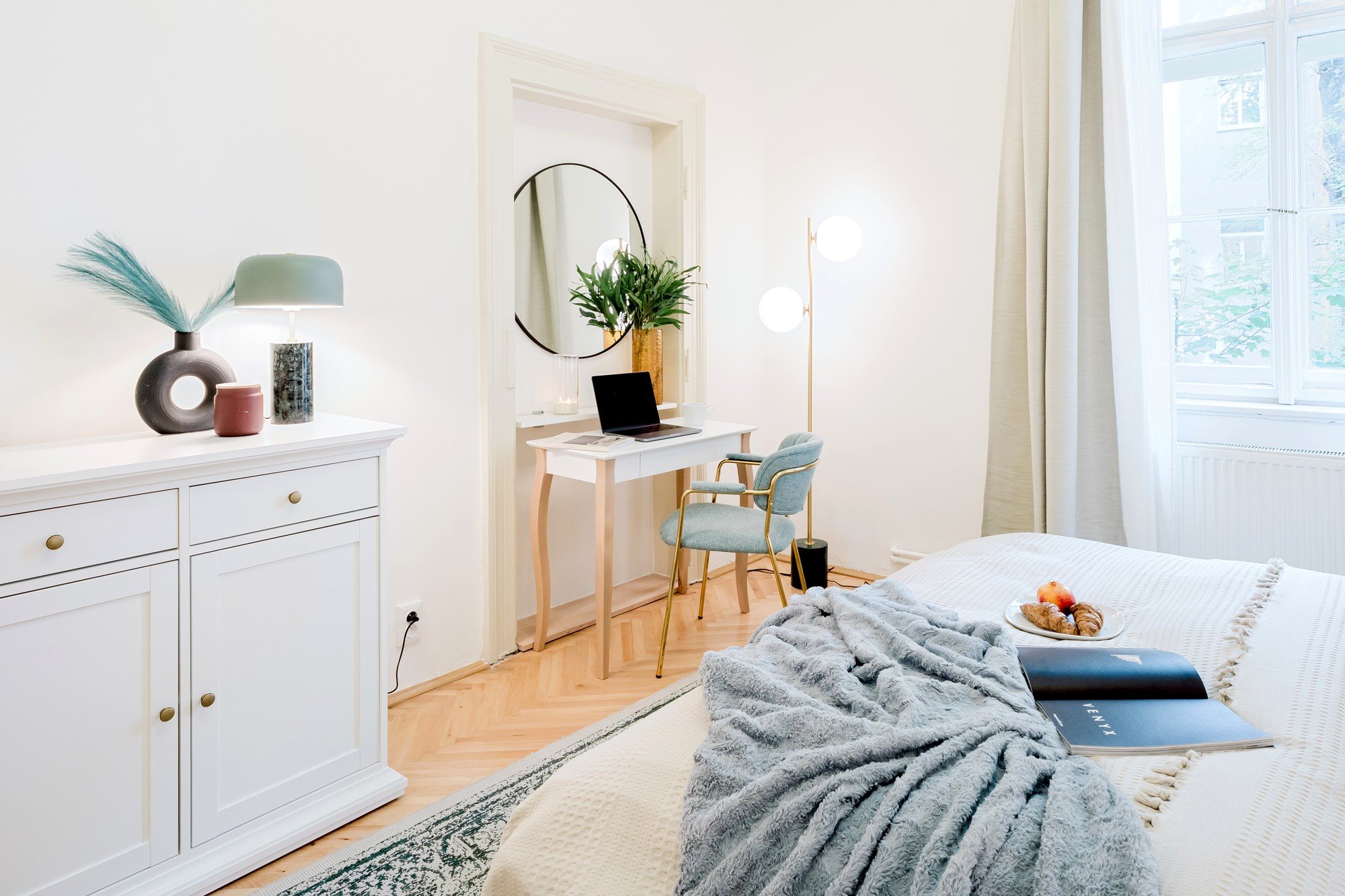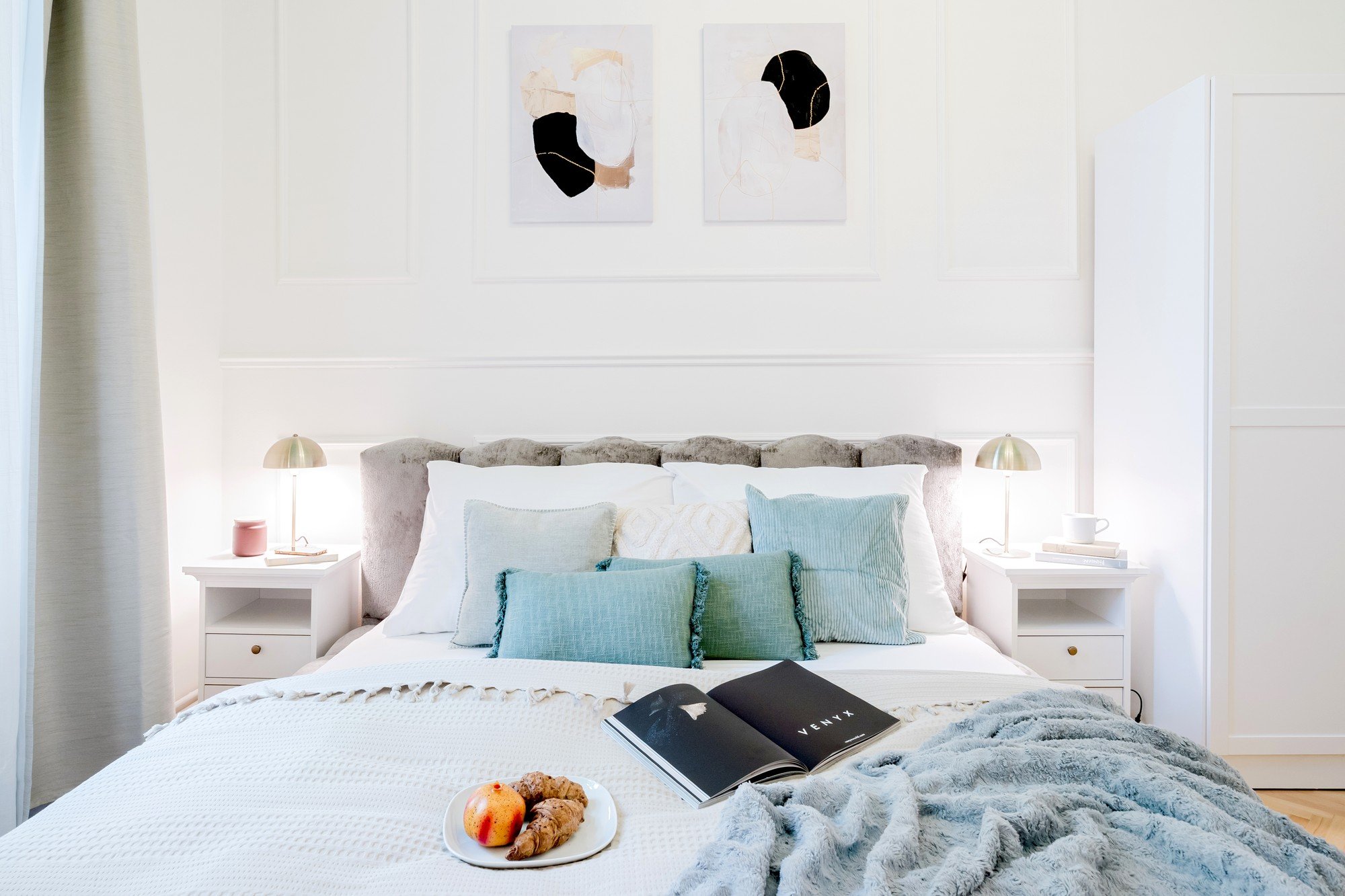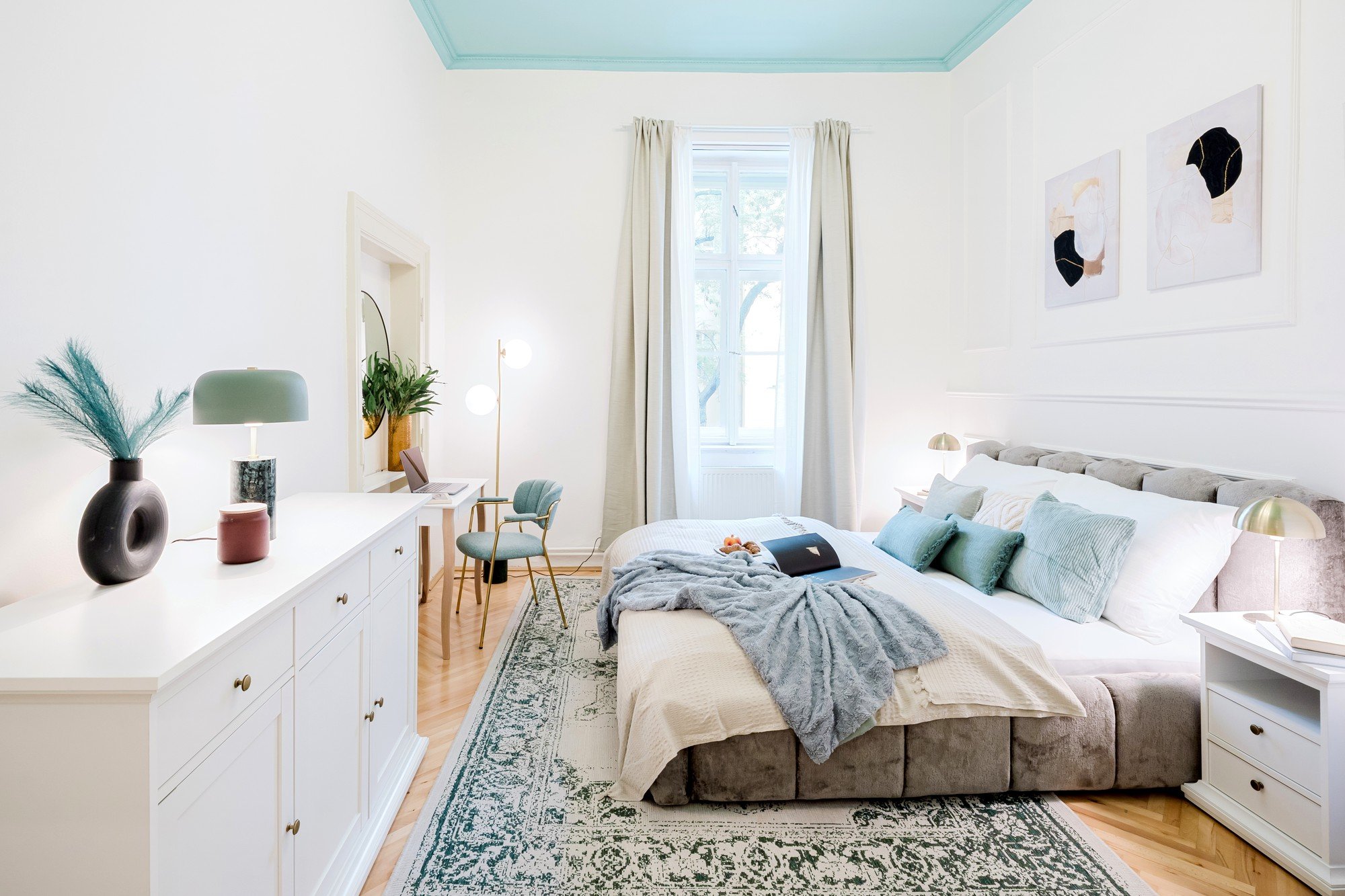 Questo trilocale destinato all'affitto a breve termine è stato realizzato in un classico edificio caratterizzato da soffitti alti. Proprio questa generosa altezza ha ispirato l'intero progetto. I soffitti dipinti con colori vivaci conferiscono all'interno un carattere unico e ne sottolineano le proporzioni, mentre gli elementi glamour, le modanature decorative e i dettagli dorati rendono l'intero appartamento un insieme elegante e impossibile da dimenticare.