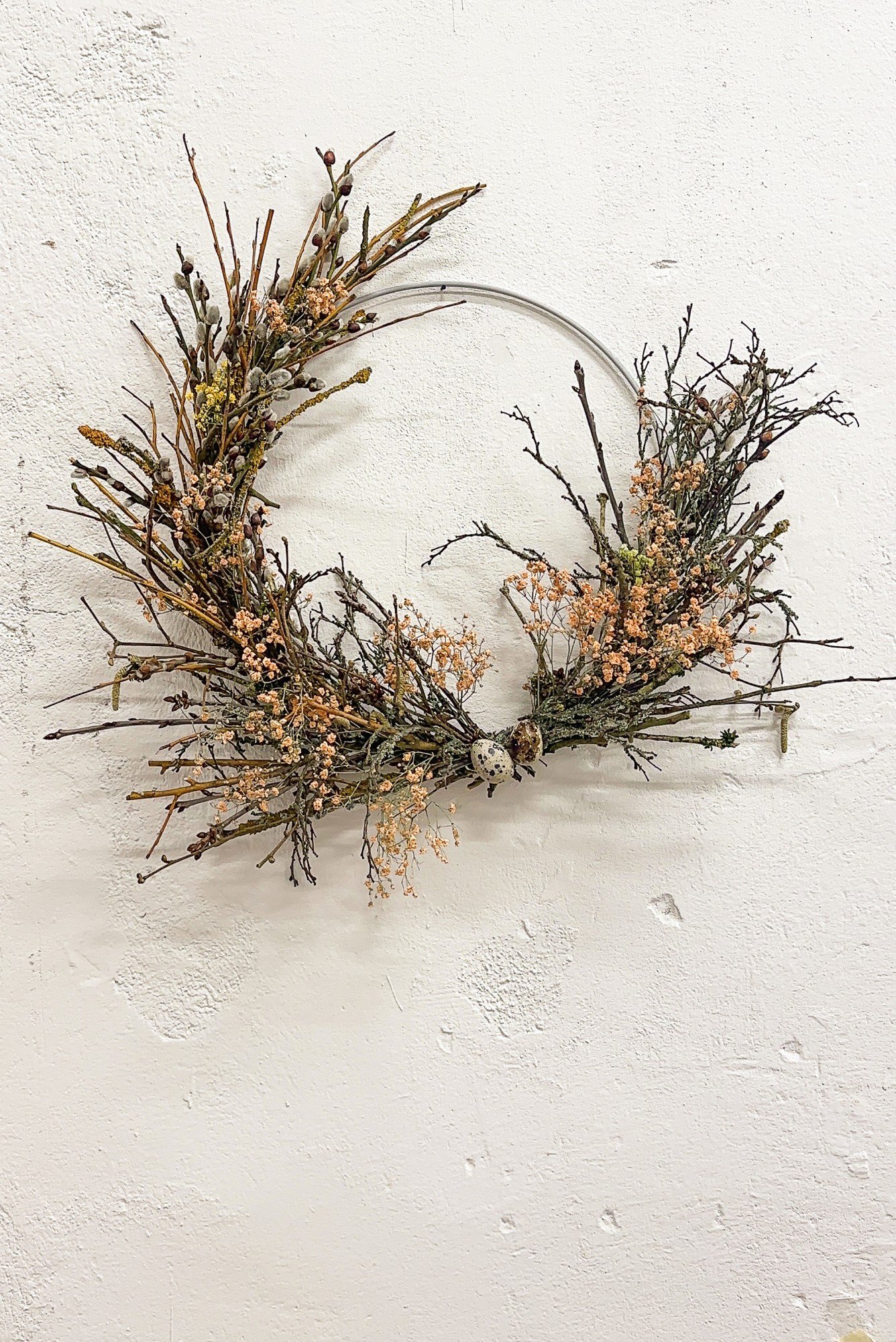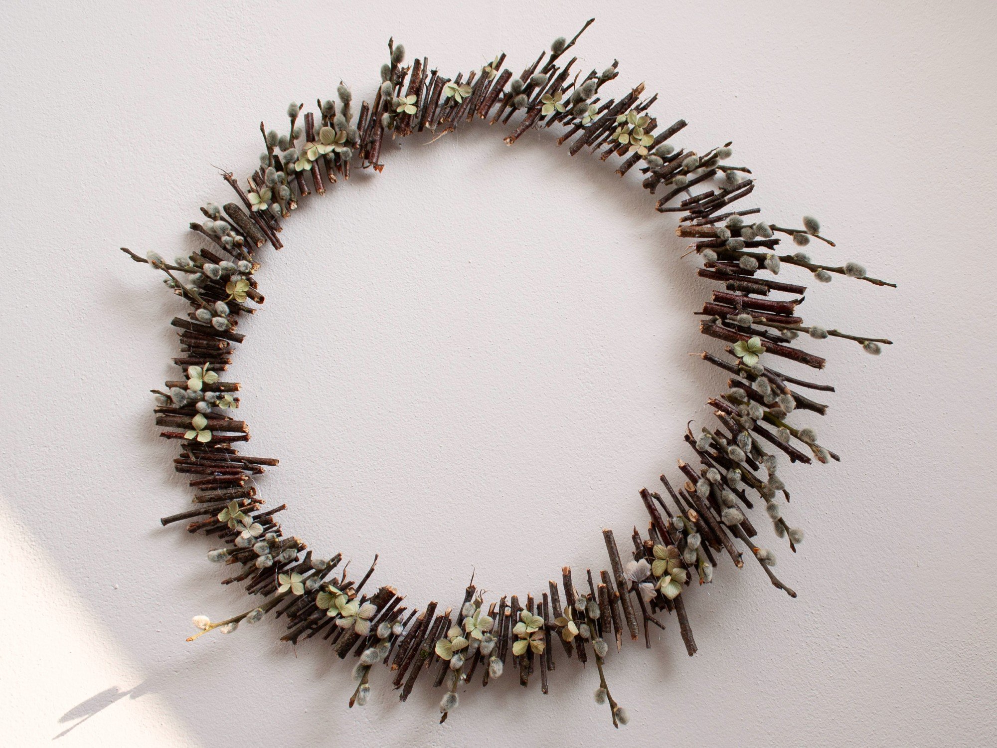 Ghirlanda primaverile con ramoscelli di mirtillo e gypsophila.