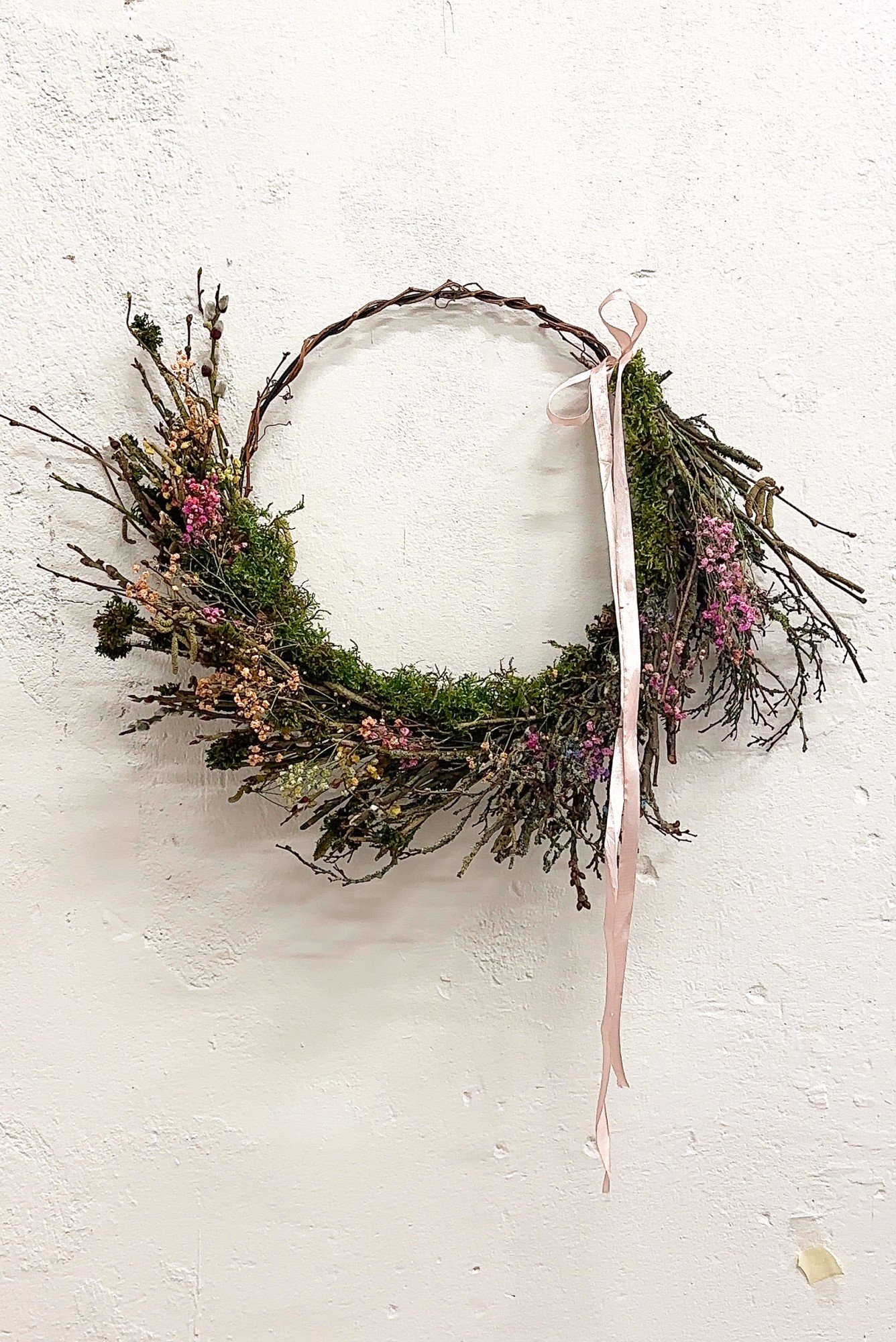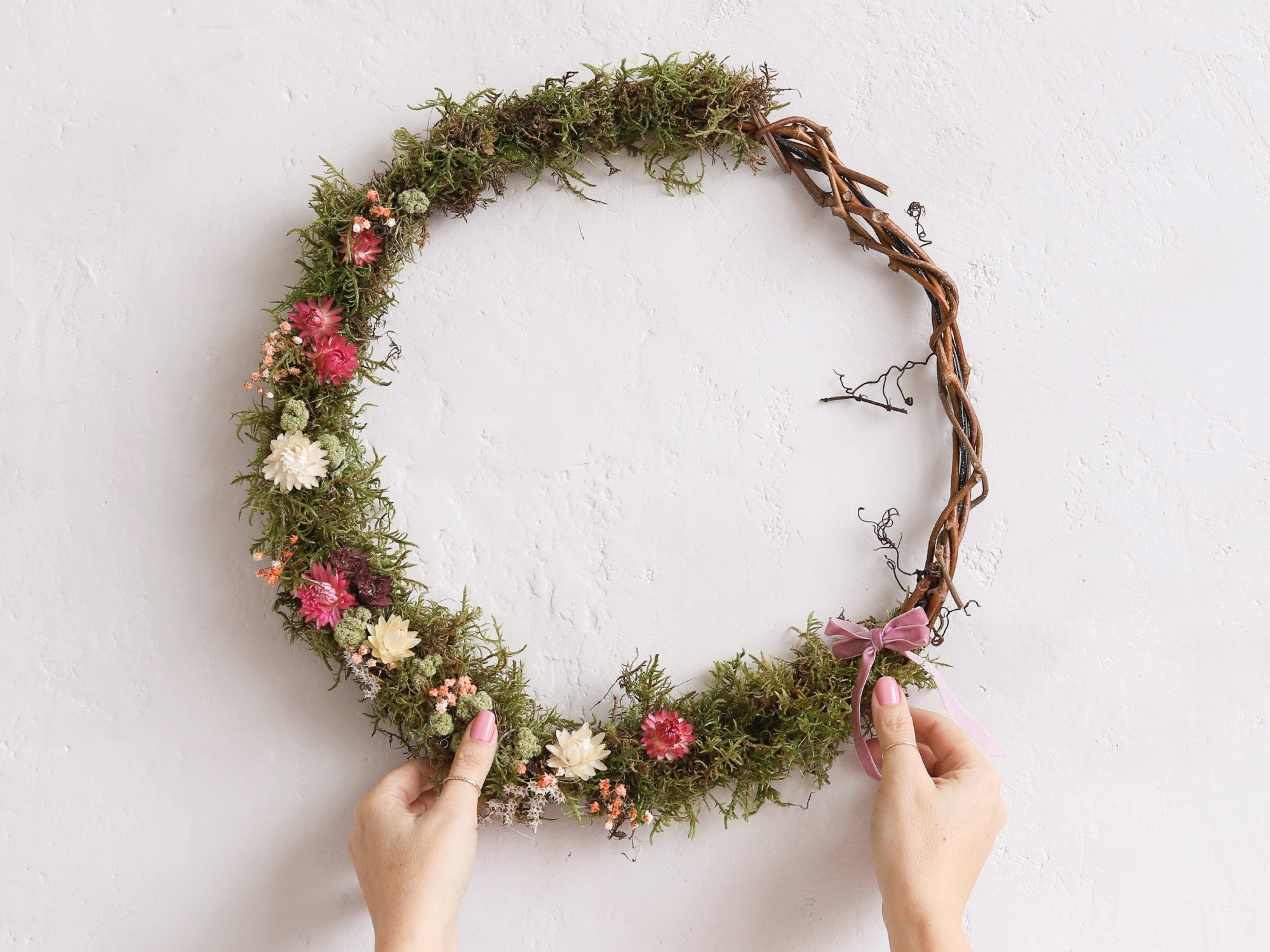 Quando in primavera pulirai grondaie, muretti e aiuole, troverai sicuramente dei pezzi di muschio e potrai usarli per creare una ghirlanda. Puoi avvolgerli attorno a una base di paglia o a un cerchio di vimini. Sono facili da fissare con del filo metallico, preferibilmente verde così da mimetizzarlo. Infine, decora la ghirlanda con fiori secchi di colore rosa, giallo o bianco.