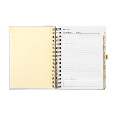 L'agenda copre 13 mesi, da agosto ad agosto dell'anno successivo. Consente una pianificazione settimanale e mensile. I pratici divisori facilitano la navigazione all'interno dell'anno. Una tasca sul retro consente di tenere insieme gli appunti importanti o i biglietti da visita per non perderli più.