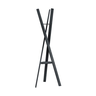 L'appendiabiti è realizzato in legno di quercia di colore nero e completato da elementi metallici. Le tre doghe di legno sono ingegnosamente collegate da elementi metallici triangolari, creando un'unità stabile e funzionale. È inclusa anche una piastra rotonda per riporre chiavi o borse.