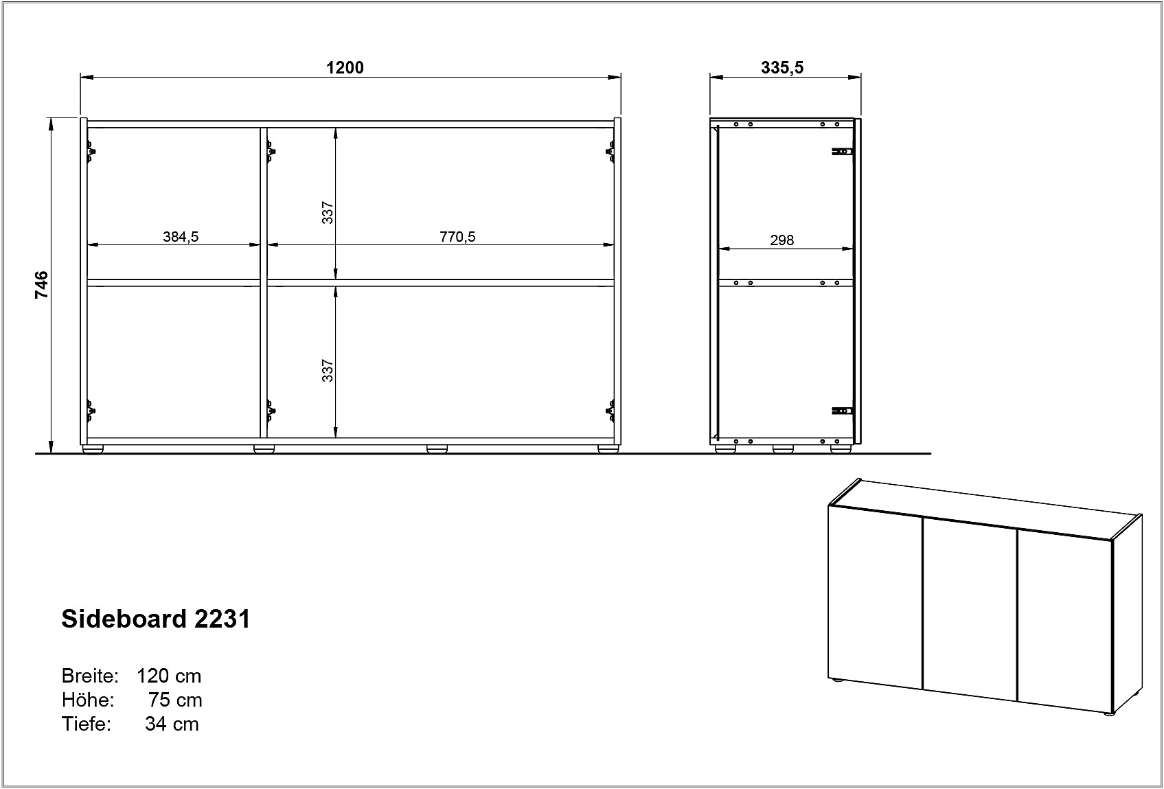 Con effetto rovereIn truciolatoTrattamento della superficie: melaminaColor cremaLarghezza totale 120 cmAltezza totale 76 cmProfondità totale 34 cm