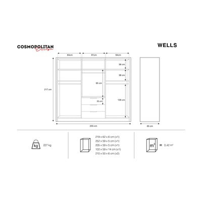 In MDFTrattamento della superficie: laminazioneBiancoLarghezza totale 255 cmAltezza totale 217 cmProfondità totale 65 cm