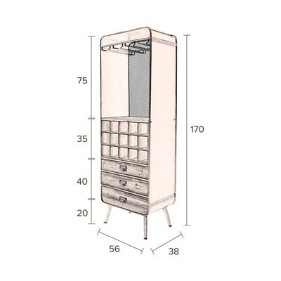 In abete massiccioIn MDFMarroneNumero di bottiglie 15MarroneLarghezza totale 56 cmAltezza totale 170 cmProfondità totale 38 cm