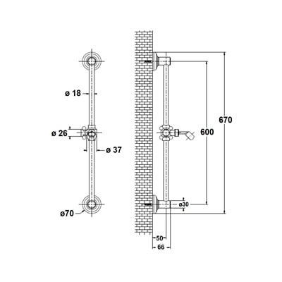 Questa asta per doccia (lunga 67 cm, compresi i tappi) è dotata di un supporto per doccetta scorrevole. L'interasse delle viti di montaggio è di 60 cm.