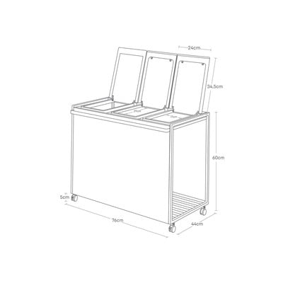 Il contenitore in tre parti è un aiuto pratico per la raccolta differenziata. È dotato di ruote con maniglie per una facile movimentazione. La struttura in metallo è dotata di coperchi incernierati in plastica con telaio per