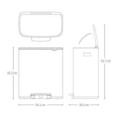 Con due contenitori di plastica separati (11 e 23 l), questo cestino è ideale per differenziare facilmente i rifiuti. Ciascuno di essi può essere facilmente rimosso dalla base per facilitare la manutenzione. Il coperchio si apre facilmente con il pedale. Se hai bisogno di tenerlo aperto, fermalo con il pulsante rosso.