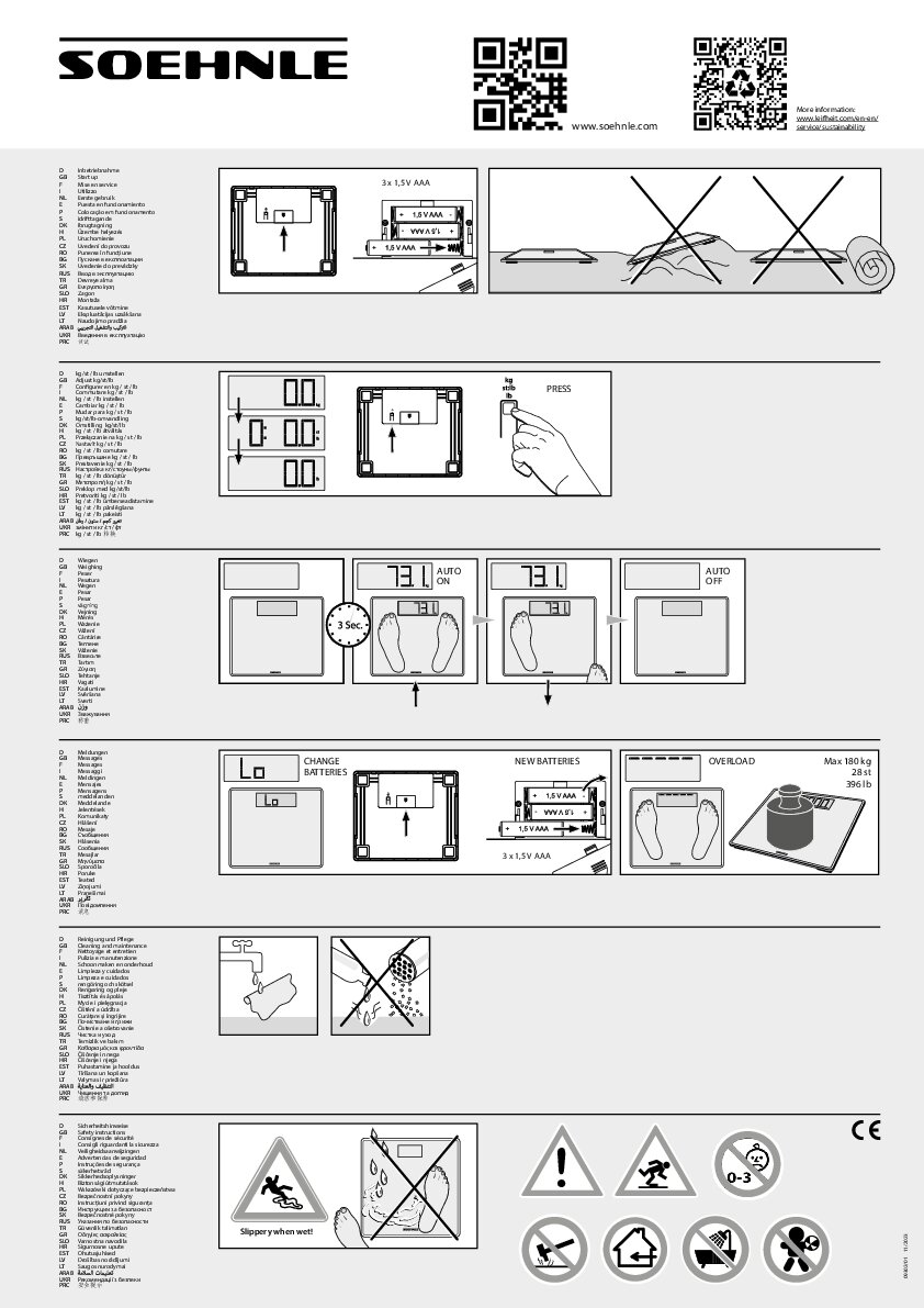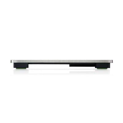 La bilancia pesapersone Sense Safe 300 di Soehnle è una bilancia digitale ultrasottile con un'impronta extra-large in acciaio inox antitraccia. È dotata di un ampio display LCD con cifre da 4,5 cm. La portata massima è di 180 kg con una precisione di pesata di 100 g. La bilancia si accende automaticamente all'ingresso e si spegne dopo la pesata. È alimentata da tre batterie AAA, incluse e fissate da una vite.