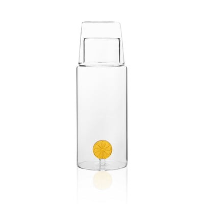 Il suo design minimalista è completato da un pratico bicchiere di vetro che funge anche da coperchio. La caraffa presenta un interessante dettaglio sul fondo a forma di fetta di limone.
