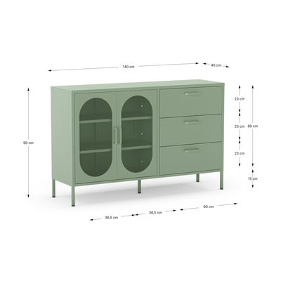 Cassettiera DioraIn metallo, trattamento della superficie: verniciatura a polvere, color menta, larghezza totale 140 cm, altezza totale 90 cm, profondità totale 40 cm