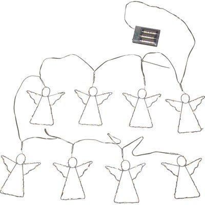 La catena è alimentata a batteria ed è decorata con 8 angeli in metallo argentato, ciascuno illuminato da 10 luci LED in bianco caldo.