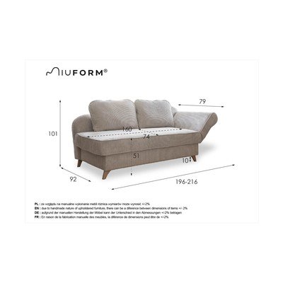 Con penisola a destraCon rivestimento in velluto a costeGrigio tortoraLarghezza totale 216 cmProfondità totale 92 cmPeso 62 kg