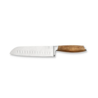 Il coltello Santoku del brand Holm fa parte della sua linea di coltelli eccellenti. Il manico, realizzato in legno di acacia con un motivo caratteristico, è splendidamente arrotondato e si adatta comodamente alla mano. L'estremità del manico è elegantemente rifinita con un cappuccio in acciaio.