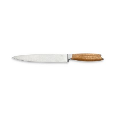 Il manico in legno di acacia con un motivo caratteristico è splendidamente arrotondato e si adatta comodamente alla mano. All'estremità della lama si trova un elegante cappuccio in acciaio. Inoltre, la parte in legno del manico è certificata FSC™, che garantisce un approvvigionamento sostenibile del legno.