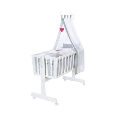 Il set comprende un materasso, un nido, un baldacchino con supporto e un set di ruote con freno. Il materasso e il copricuscino (40 x 35 cm) e il copripiumino (80 x 80 cm) sono realizzati in cotone al 100%. L'imbottitura della coperta per neonati è costituita da fibre climatiche traspiranti e termoregolanti.