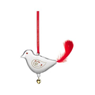Questa decorazione è realizzata in vetro soffiato a mano, il che ne garantisce l'unicità. Visivamente, è decorata con un cuore rosso al posto dell'occhio, cuori dorati sul corpo, una vera piuma rossa come coda e un piccolo ciondolo dorato a forma di cuore che pende dalla base. È incluso anche un nastro di seta per poter appenderla all'albero, alla finestra o ai rami delle conifere. Si abbina perfettamente agli altri pezzi della collezione Natale nostalgico. Ann-Sofi Romme crea la sua collezione natalizia per Holmegaard dal 1993 e ognuno di essi porta con sé una storia natalizia originale che risveglia in molti la gioia e i ricordi di romantici momenti natalizi.