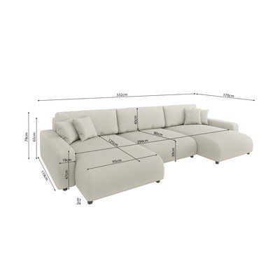 Con rivestimento in velluto a coste, allungabile/con contenitore, a U, color crema, a cinque o più posti, larghezza totale 332 cm