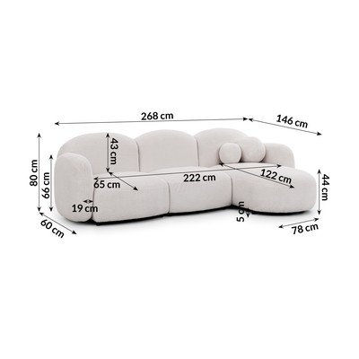 Con rivestimento in boucléCon penisola a destra/con chaise loungeColor cremaIdrorepellente/antimacchiaA quattro postiLarghezza totale 268 cm