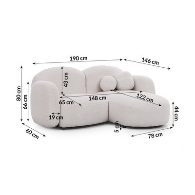 Con rivestimento in boucléCon penisola a destra/con chaise loungeColor cremaIdrorepellente/antimacchiaA due postiLarghezza totale 190 cm