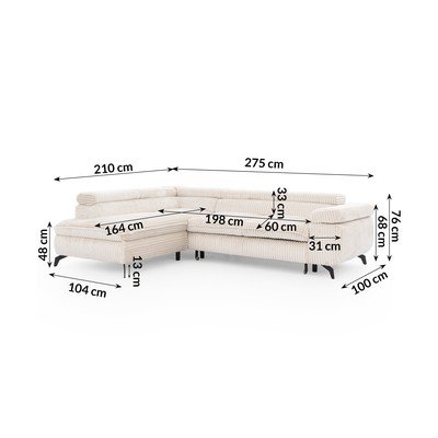 Con rivestimento in velluto a costeReclinabile/allungabile/con contenitoreCon penisola a sinistra/a LColor cremaAdatto per animali/antimacchiaA quattro postiLarghezza totale 275 cm