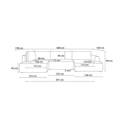 Divano angolare LucienCon rivestimento in velluto a coste, allungabile/con contenitore, con penisola a destra/a U, color senape, a cinque o più posti, larghezza totale 408 cm