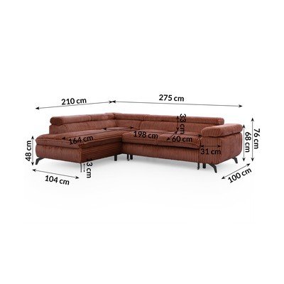 Con rivestimento in velluto a costeReclinabile/allungabile/con contenitoreCon penisola a sinistra/a LColor terracottaAdatto per animali/antimacchiaA quattro postiLarghezza totale 275 cm