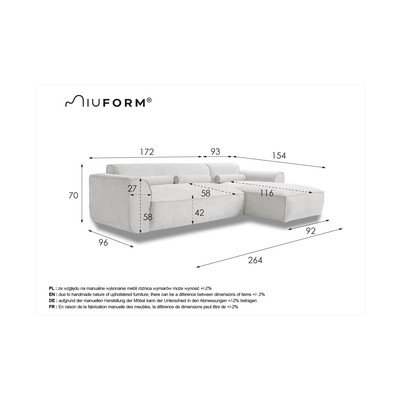Con penisola a destra/con chaise loungeColor cremaA tre postiLarghezza totale 264 cmProfondità totale 154 cmProfondità della seduta 58 cm