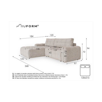 Allungabile/con contenitoreCon penisola a sinistraColor cremaA tre postiLarghezza totale 268 cmProfondità totale 184 cmProfondità della seduta 56 cm