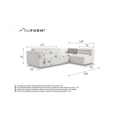 Con penisola a destra/a LVerdeA quattro postiLarghezza totale 265 cmProfondità totale 169 cmProfondità della seduta 58 cm