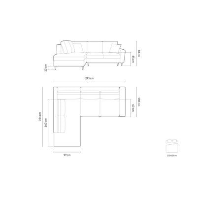 Divano angolare KyotoCon rivestimento in velluto, allungabile/con contenitore, con penisola a sinistra/a L, verde, a quattro posti, larghezza totale 243 cm