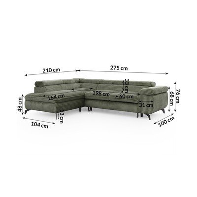 Con rivestimento in velluto a costeReclinabile/allungabile/con contenitoreCon penisola a sinistra/a LVerdeAdatto per animali/antimacchiaA quattro postiLarghezza totale 275 cm