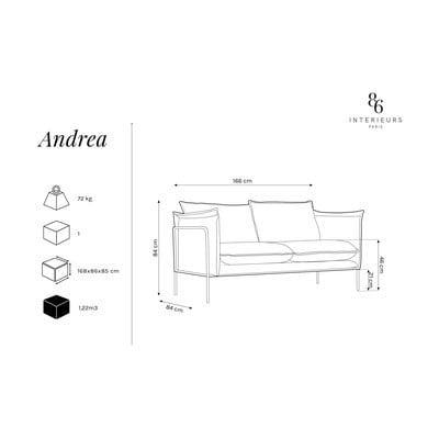 Portate a casa vostra pezzi comodi ed eleganti. Il divano Andrea di Interieurs 86 catturerà la vostra attenzione per il suo aspetto colorato con una struttura nera che accentua il suo design moderno. La piacevole superficie è composta per il 70% da poliestere proveniente da bottiglie in PET riciclate e da una tecnologia che facilita la pulizia delle macchie.