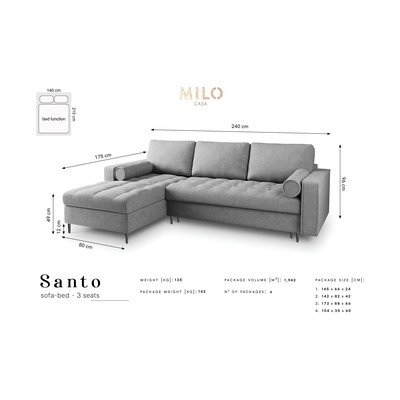 Un divano spazioso dove potersi accoccolare tutti insieme è il fondamento di un salotto familiare. Il marchio Milo Casa dall'Italia lo sa bene ed è sinonimo di qualità raffinata e di un design imponente ed elegante. Il divano letto Santo offre un grande spazio di relax per tutta la famiglia e aggiunge un tocco di lusso agli interni. I tessuti utilizzati da questo marchio sono sottoposti a test rigorosi per garantire massima durata, comfort e stile accattivante. Per questo motivo, per rivestire questo divano è stato utilizzato un bellissimo tessuto con una leggera lucentezza e un pelo corto, molto piacevole al tatto e anche molto resistente all'abrasione. La tecnica Liquid Blocked utilizzata sul tessuto rende difficile l'assorbimento dei liquidi, che si raccolgono sulla superficie del materiale senza penetrare in profondità nelle fibre. Di conseguenza, il caffè, il tè o il vino versati sul tessuto vengono rimossi in pochi secondi applicando un panno leggermente assorbente o un tovagliolo di carta.