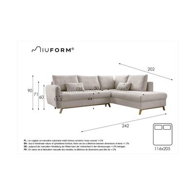 Il divano Lagom unisce semplicità, funzionalità ed estetica. Grazie alla sua struttura essenziale e alle alte gambe in legno di faggio, appare leggero e dona un tocco di stile scandinavo agli interni. Il divano è dotato anche di una modalità divano letto e di uno spazio di archiviazione. Può quindi essere utilizzato come letto per gli ospiti. Godetevi il comfort con il marchio Miuform.