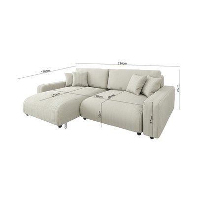 Con rivestimento in velluto a costeAllungabile/con contenitoreCon penisola a destra/con penisola a sinistra/con composizione variabile/con chaise loungeColor cremaA tre postiLarghezza totale 234 cm