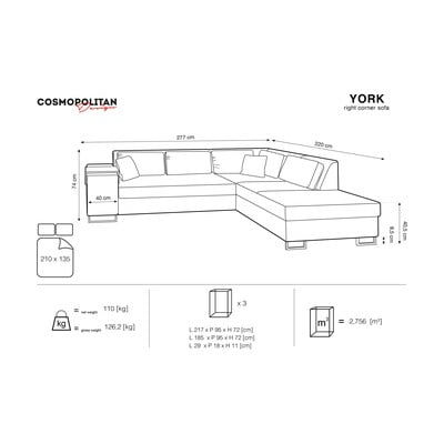 Divano angolare YorkCon rivestimento in velluto, allungabile/con contenitore, con penisola a destra, idrorepellente/adatto per animali, grigio chiaro, a quattro posti, larghezza totale 277 cm