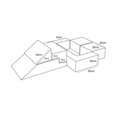 Il set è composto da blocchi morbidi rivestiti in velluto a coste, piacevoli al tatto e facili da tenere puliti, per garantire un ambiente di gioco igienico. I singoli pezzi possono essere assemblati in diverse configurazioni: da un comodo divano a una sicura vasca per le palline, fino a un vero e proprio parco giochi.