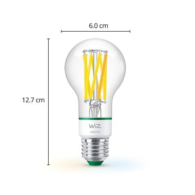 La lampadina intelligente WiZ a filamento è la lampadina più efficiente dal punto di vista energetico del sistema di illuminazione intelligente WiZ. Grazie alla sua classe energetica A, consuma il 40% di energia in meno rispetto alle lampadine LED standard.
