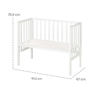 Il lettino comprende un materasso di alta qualità da 45 x 90 cm in schiuma PU testata, un coprimaterasso in rete traspirante e una barriera di sicurezza brevettata.
