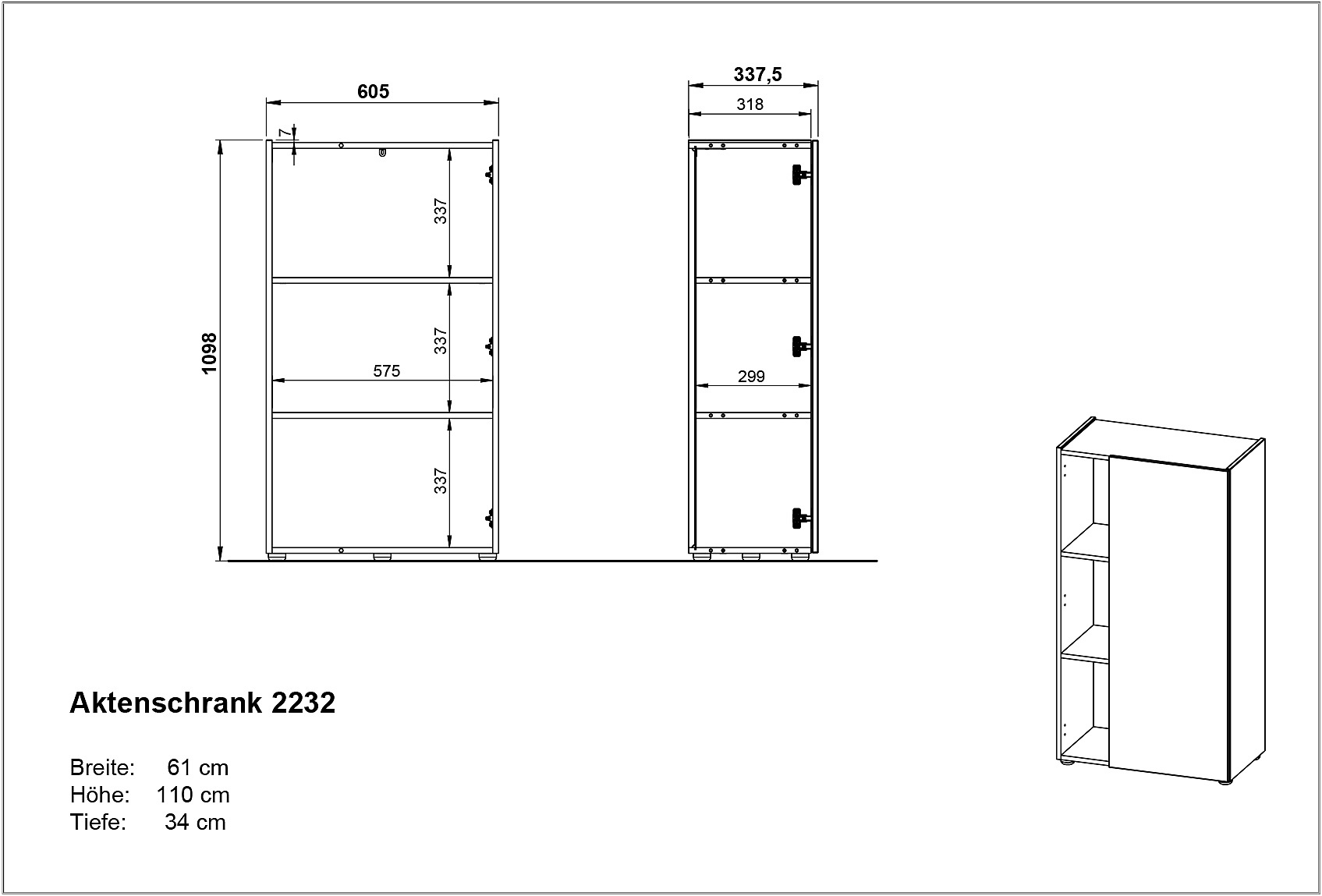 La libreria Adrano della Germania è un complemento elegante e pratico per la tua casa. La libreria è dotata di un'anta, dietro la quale si trovano due ripiani fissi. Questi dividono lo spazio in tre sezioni. L'anta copre solo 2/3 della libreria, creando tre vani aperti. Il ripiano superiore ribassato ha una capacità di carico fino a 10 kg, quello inferiore fino a 25 kg. La libreria viene fornita con cinque pattini in plastica nera.