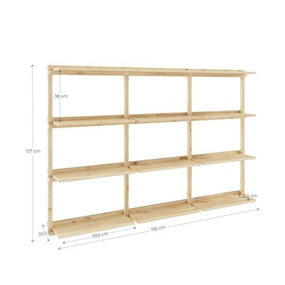 La libreria è realizzata in legno di pino in colore naturale. Le linee pulite e le proporzioni leggere le conferiscono un aspetto quasi fluttuante, mentre le giunzioni raffinate aggiungono un tocco sottile ma sofisticato. Le dimensioni della libreria sono 192 x 127 cm.