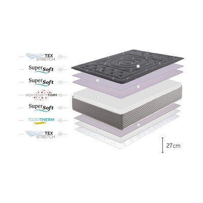 La sua composizione comprende un sistema viscoelastico multistrato di 6 cm di spessore, la schiuma SuperSoft e le fibre Biotherm, che fanno sì che questo materasso si adatti meglio al corpo e garantisca un buon riposo notturno.