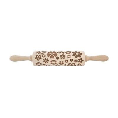 Mattarello in legno Orion con motivo floreale in rilievo. Il rullo è realizzato in legno e ha una superficie di rotolamento lunga 20 cm. È adatto per biscotti, caramelle e altro.