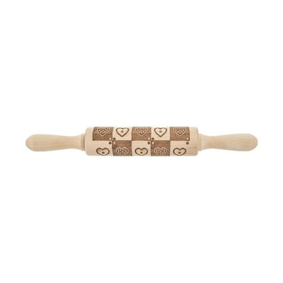 Mattarello in legno Orion con motivo a cuore in rilievo. Il rullo è realizzato in legno e ha una superficie di rotolamento lunga 16 cm. È adatto per biscotti, caramelle e altro.