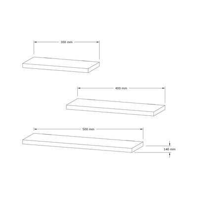 3 pzCon effetto rovereIn MDFTrattamento della superficie: melaminaDi colore naturaleLarghezza totale 50 cmAltezza totale 2 cmProfondità totale 2 cm