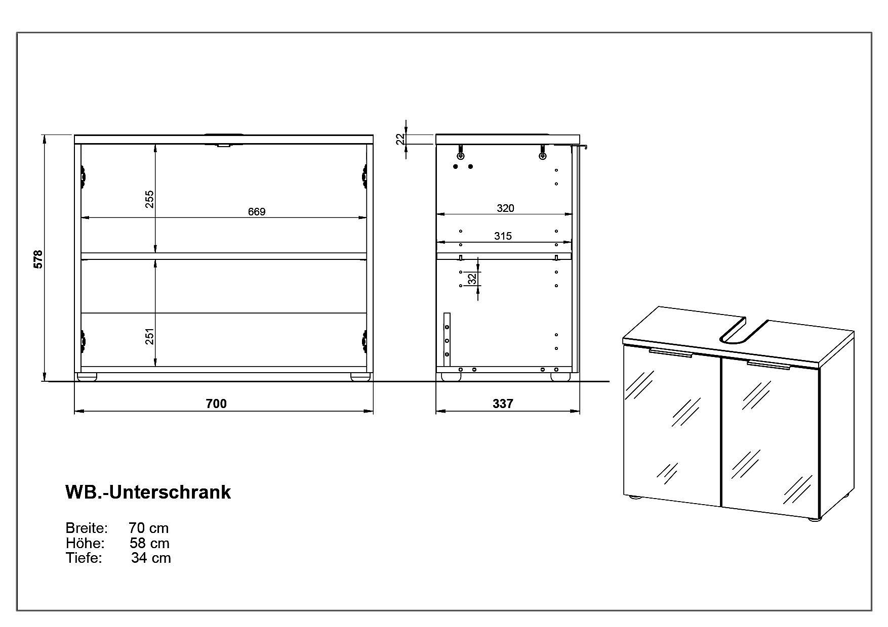 Mobile da lavabo PescaraCon effetto rovere, in truciolato, trattamento della superficie: melamina, con trama lucida, bianco, larghezza totale 70 cm, altezza totale 58 cm, profondità totale 34 cm