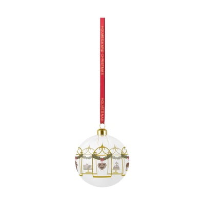 è realizzata in vetro soffiato a mano ed è completata da un nastro di seta rosso.