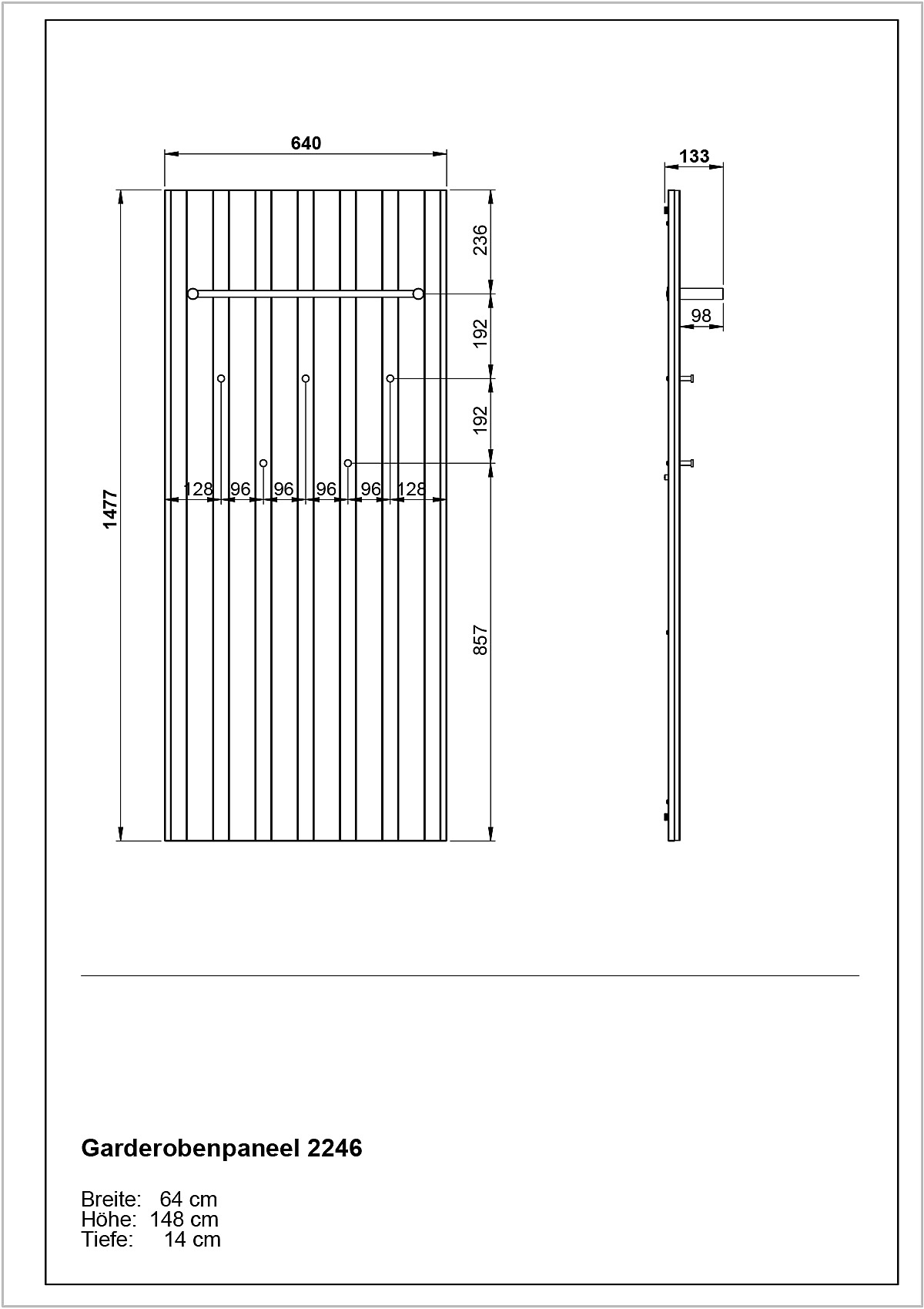 Pannello appendiabiti RenellCon effetto rovere, in truciolato, trattamento della superficie: melamina, color antracite/di colore naturale, larghezza totale 64 cm, altezza totale 148 cm, profondità totale 14 cm