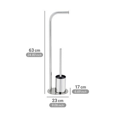 Questo accessorio indipendente in acciaio combina elegantemente un porta carta igienica con uno scopino integrato. Lo scopino è alloggiato in un contenitore separato alla base del supporto e la sua testa ha un diametro di 7,5 cm.