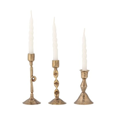 I candelieri Efsa del brand Bloomingville sono un set di tre candelieri in metallo che si distinguono per la loro delicata superficie patinata. Ogni pezzo ha un design unico e una forma diversa, che conferisce all'intero set un carattere distintivo.